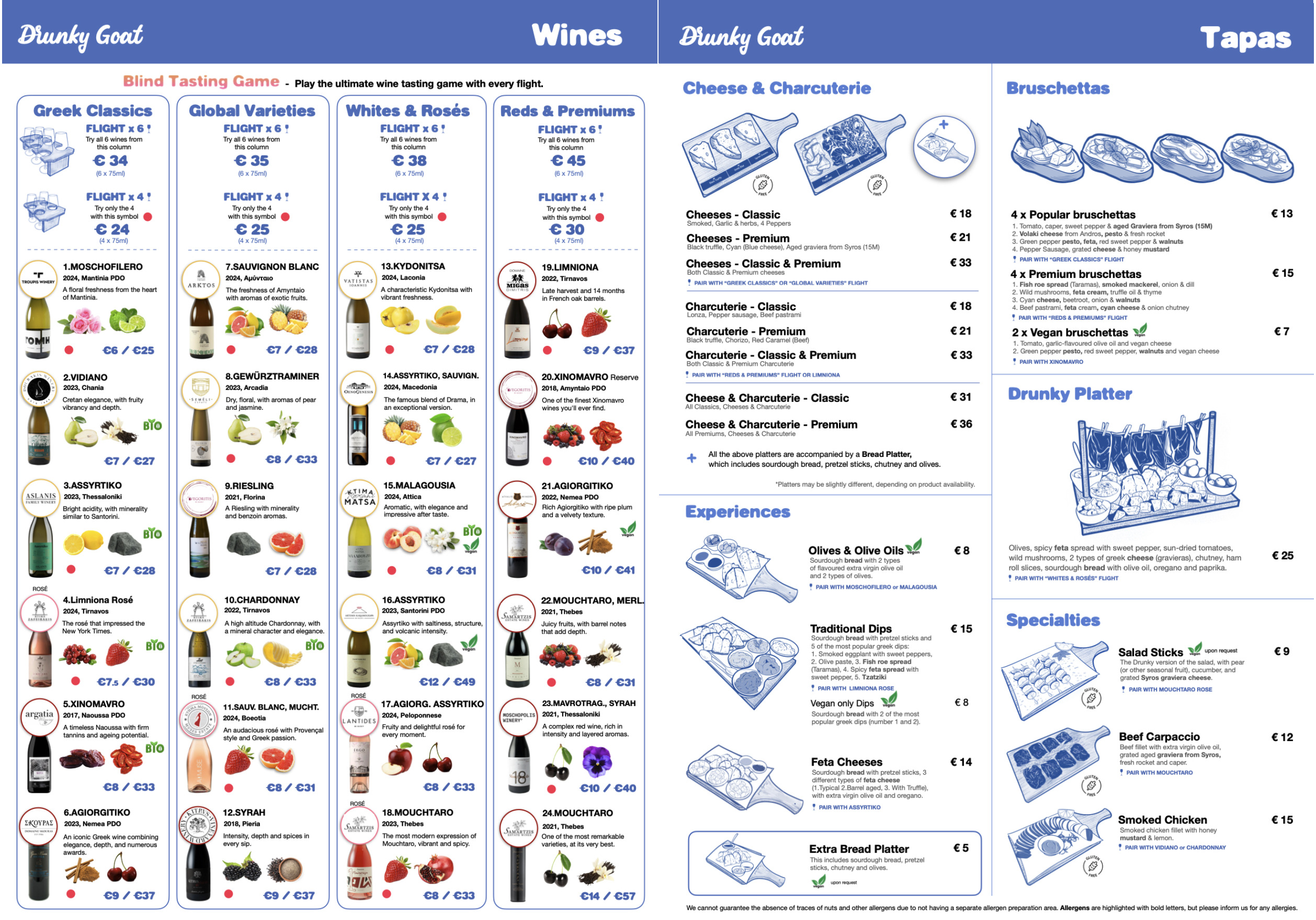 Κρατήσεις 8+ ατόμων είναι διαθέσιμες μόνο για ομαδικά wine tastings. Το μενού είναι διαθέσιμο σε